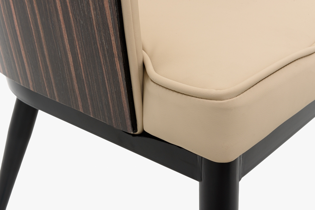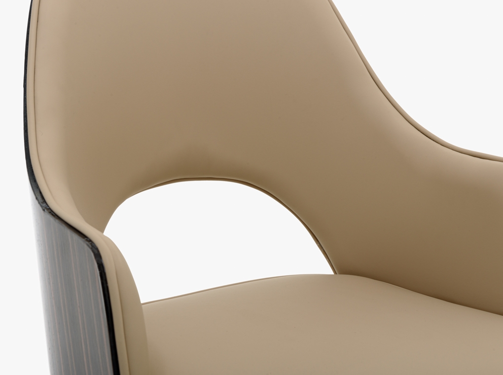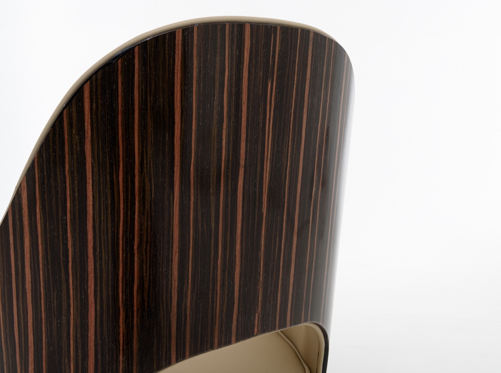 Elegáns étekzőszék hátulról fényes fa borítással, beige textilbőr kárpitozással.