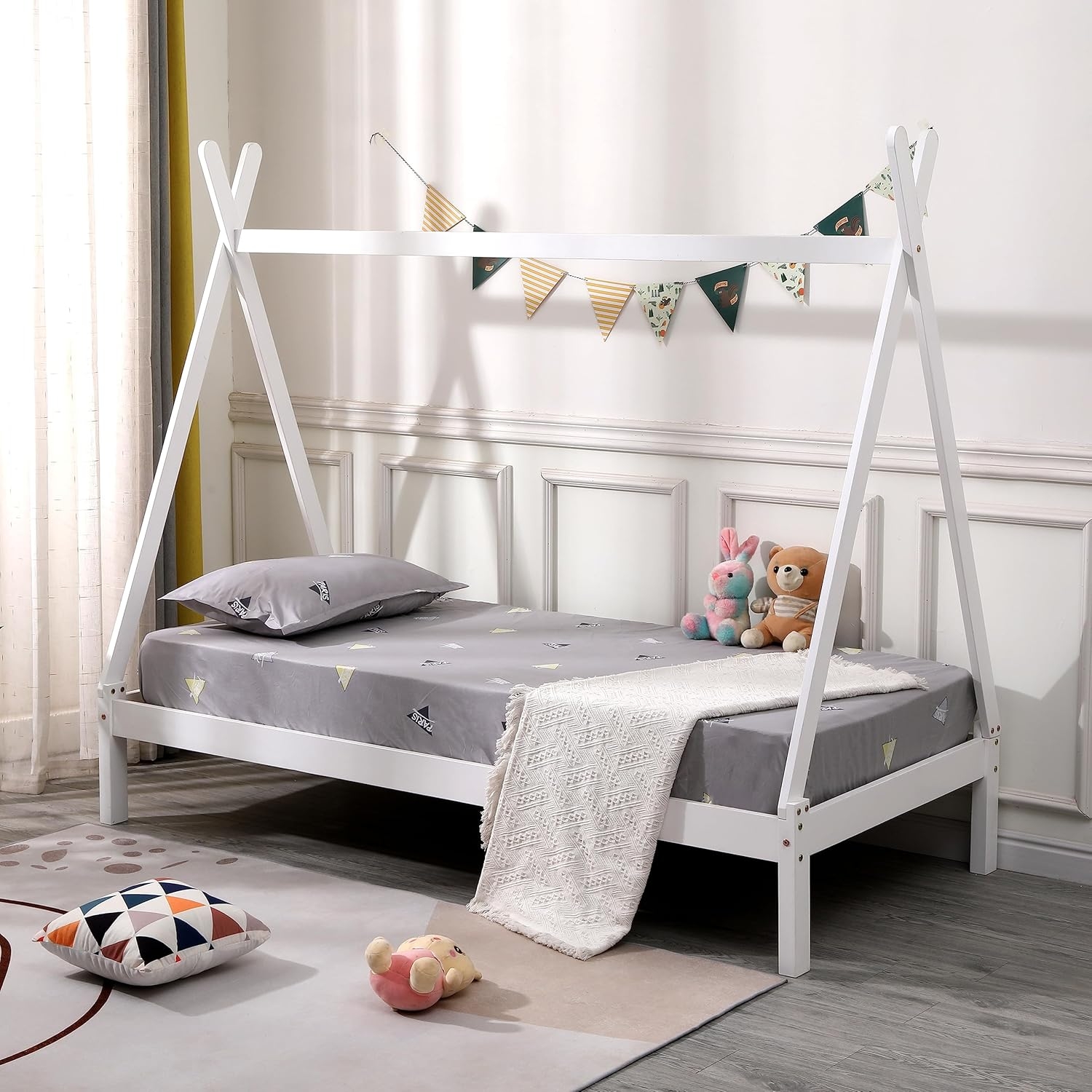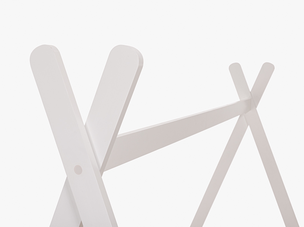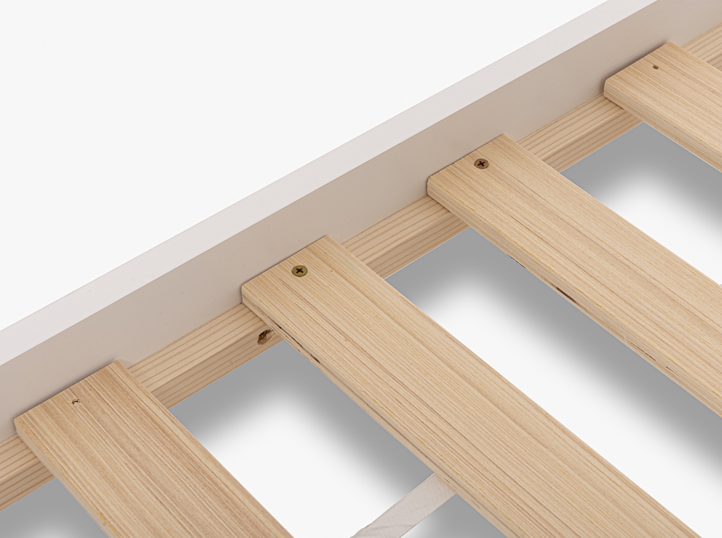 Tömör fenyőből készült gyermek ágykeret, fehér színben, házikó formájú, ágyráccsal.